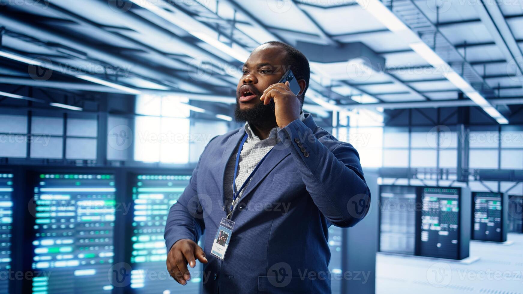 IT support worker in data center talking in phone call, doing yearly checkup. On field engineer chatting with manager in server hub during telephone call, monitoring servers infrastructure, camera B Pro Photo