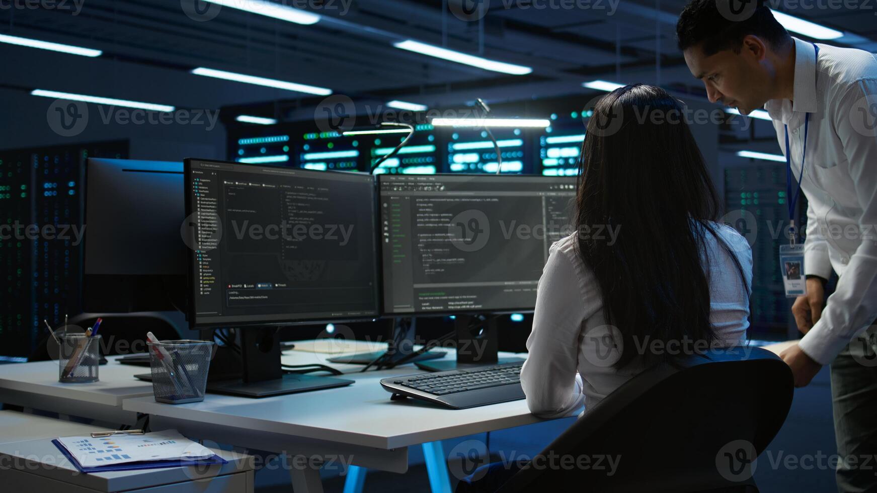 Team of programmers in data center responsible for installation and repair of networking equipment solving tasks. Teamworking colleagues doing maintenance on server room infrastructure, camera B Pro Photo