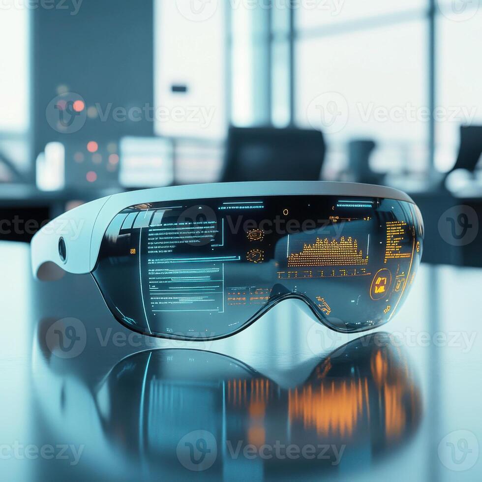 Advanced smart glasses display data analytics in a modern office setting with digital interfaces Pro Photo