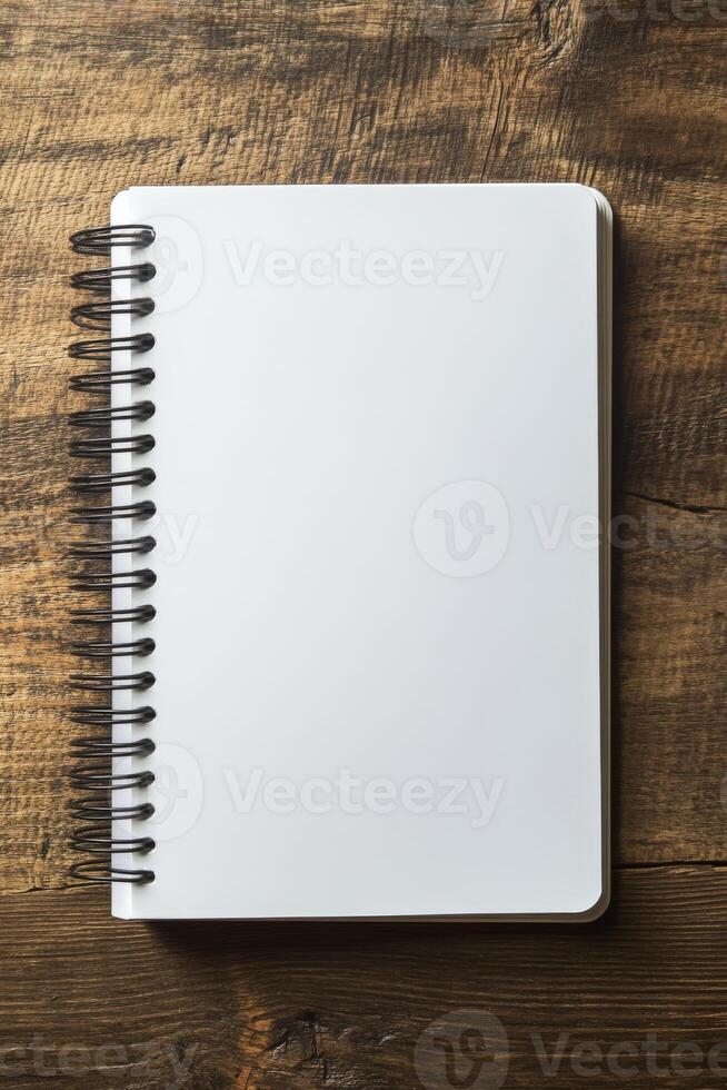 A spiral bound notebook with a blank page sits on a wooden table Pro Photo