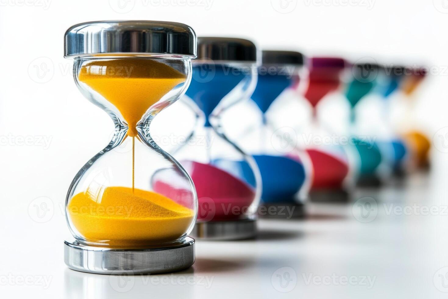 A row of sand timers with different colors and one of them is yellow Pro Photo