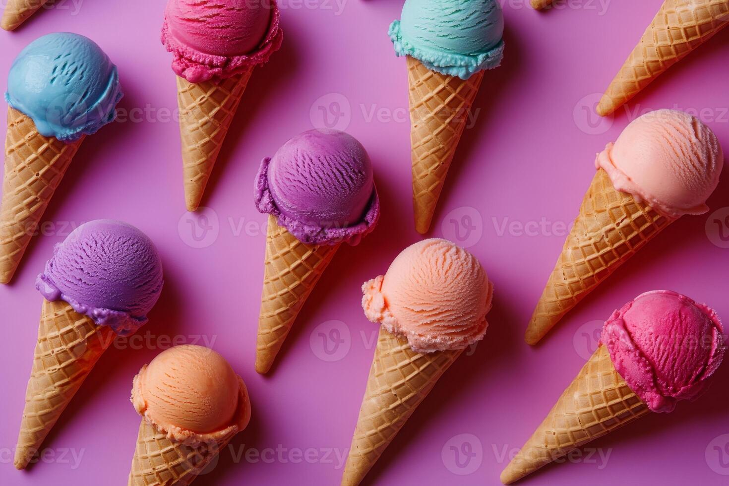 A row of ice cream cones with different colors of ice cream Pro Photo