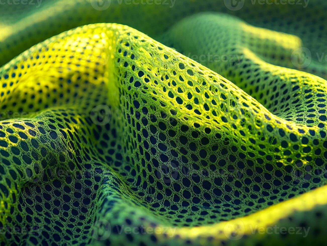 Bright neon green synthetic mesh fabric showcases its open weave and smooth texture through professional macro capture emphasizing its sporty and elastic qualities ideal for athletic wear Pro Photo