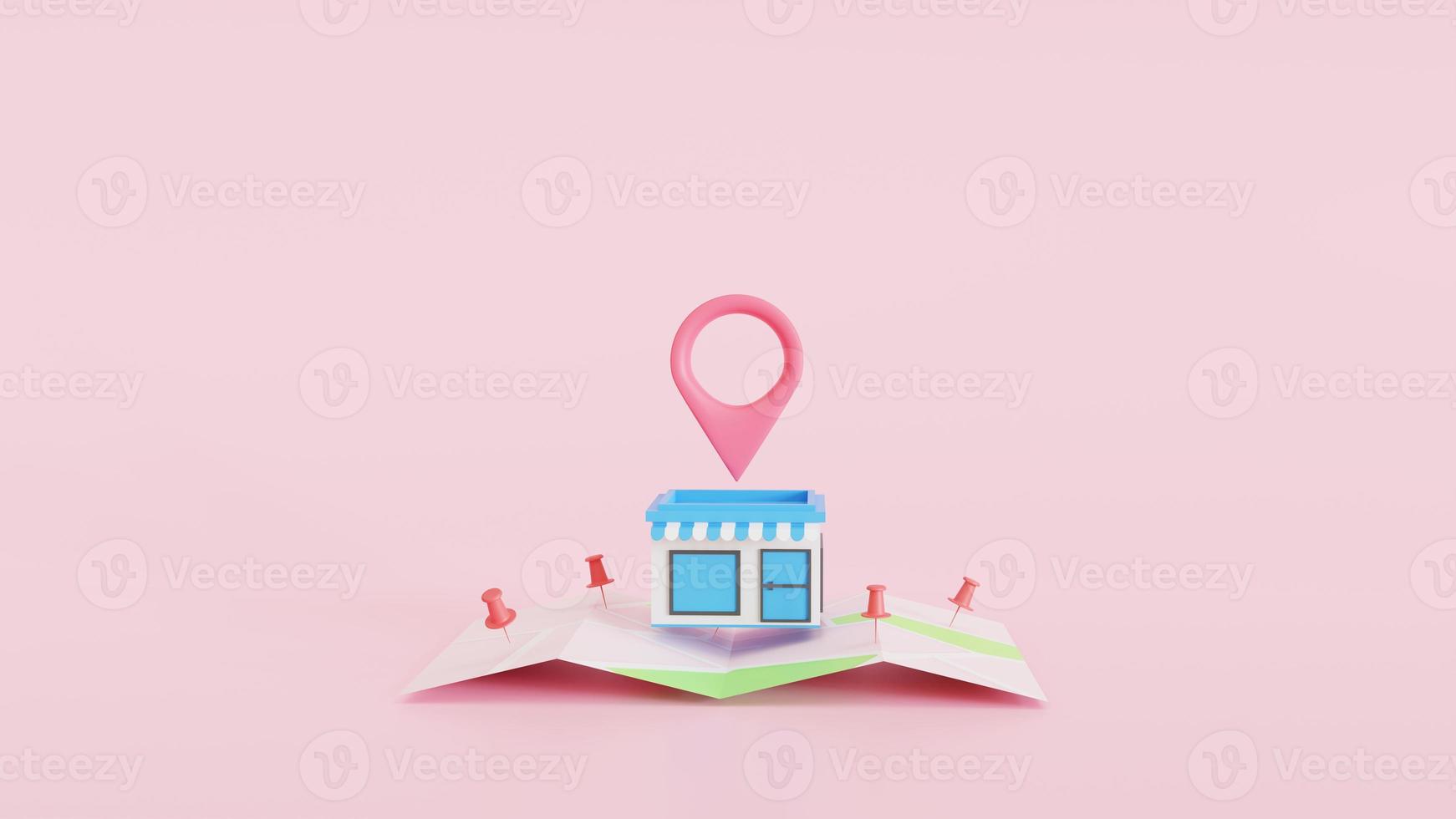 3D minimal shop with a map pin and Map pins, GPS, navigator pin checking points. The concept for delivery service. 3D render illustration Pro Photo