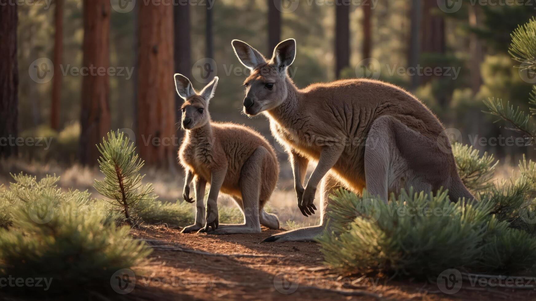 A kangaroo and its joey stand among trees in a serene forest setting. Pro Photo