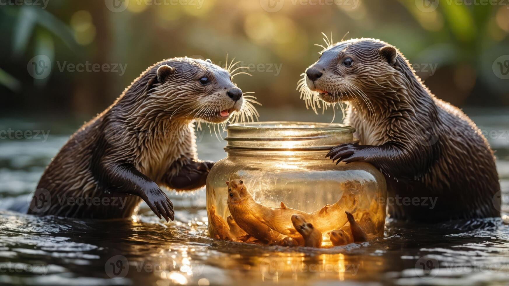 Two otters playfully interact with a jar containing fish in a serene water setting. Pro Photo