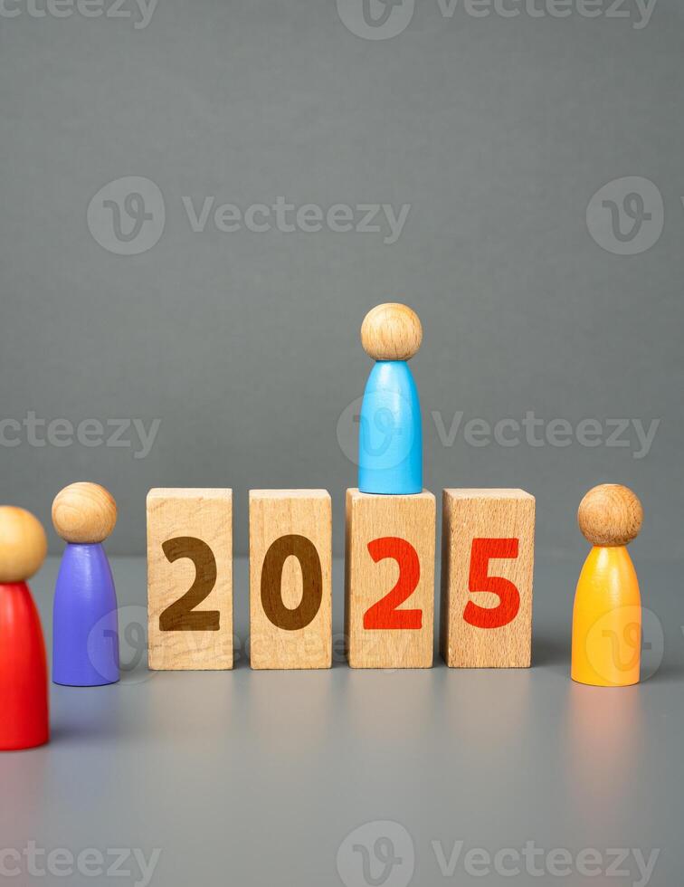 Figures of people and blocks with 2025. New Year. Plans and tasks. Visions and development in the future. Pro Photo