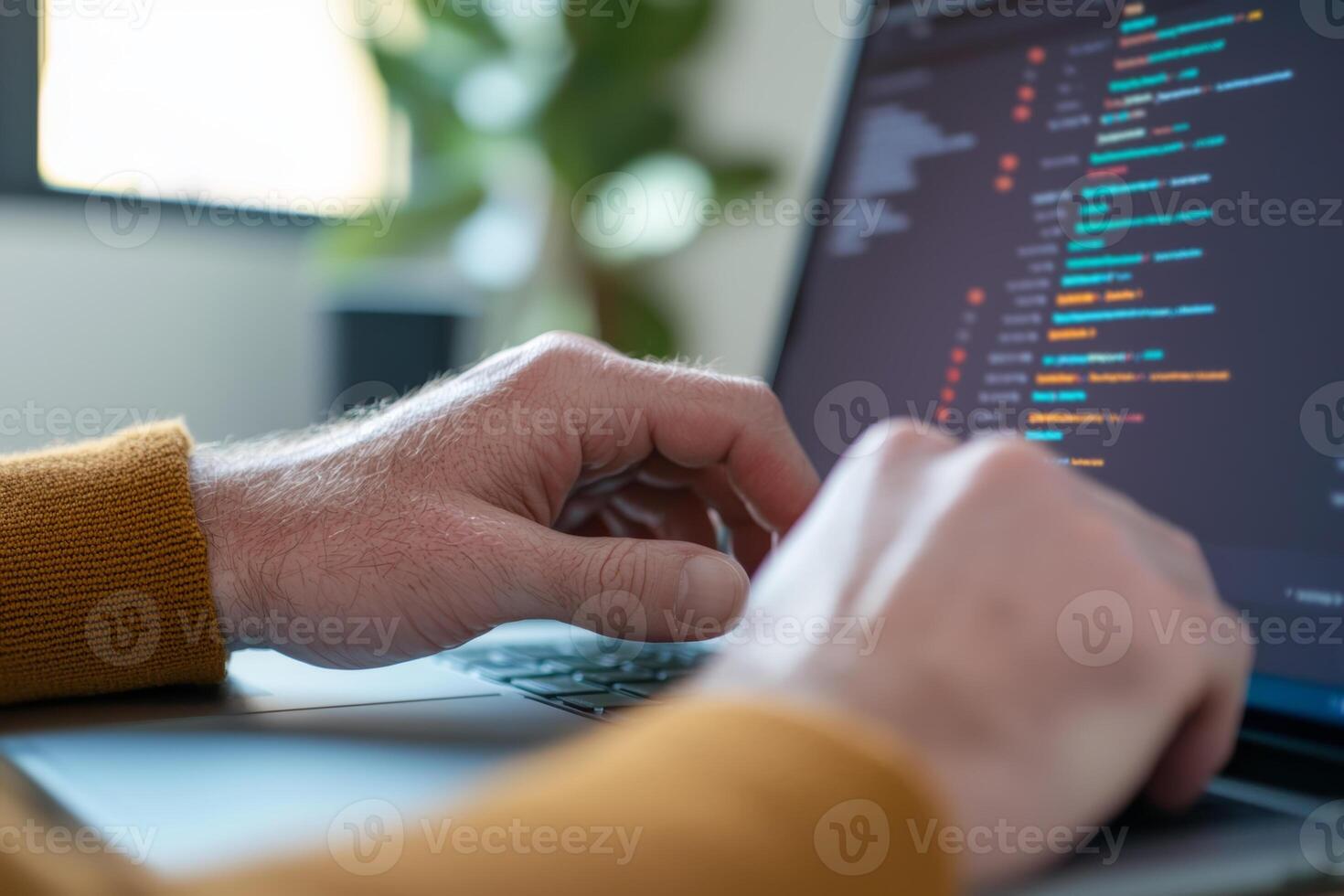A person coding on a laptop at home during the day, focusing on the screen in a well-lit workspace with plants Pro Photo