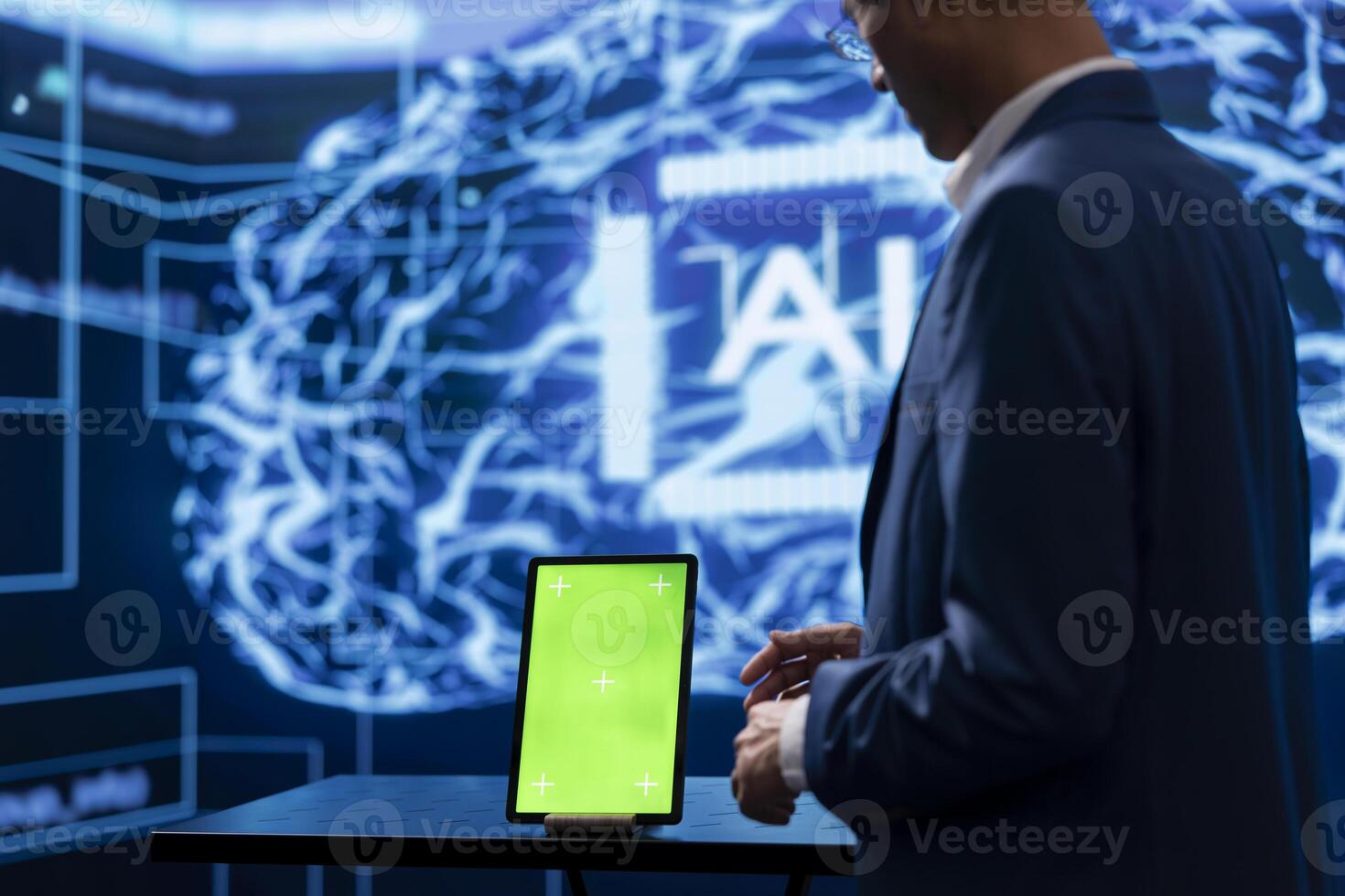 System administrator in startup doing advancements in AI field using chroma key tablet. Green screen device used by IT professional working in high tech lab featuring artificial intelligence Pro Photo