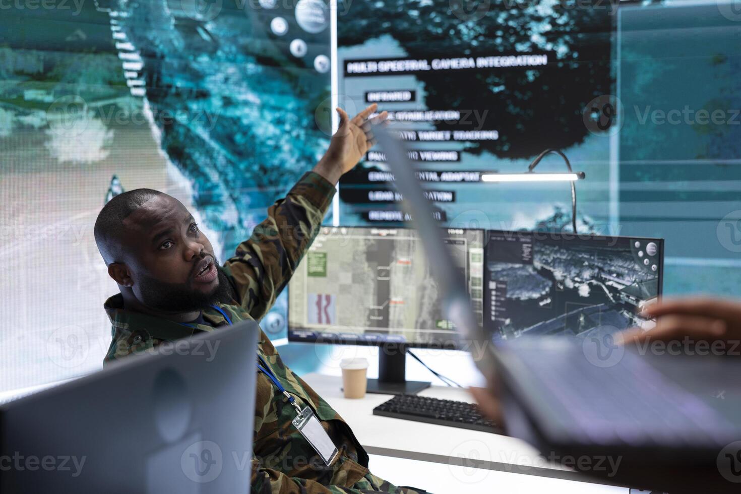 Army expert in a modern base of operations with satellite data, handling surveillance operations with real time information. Coordinating security measures and protecting national interests. Pro Photo