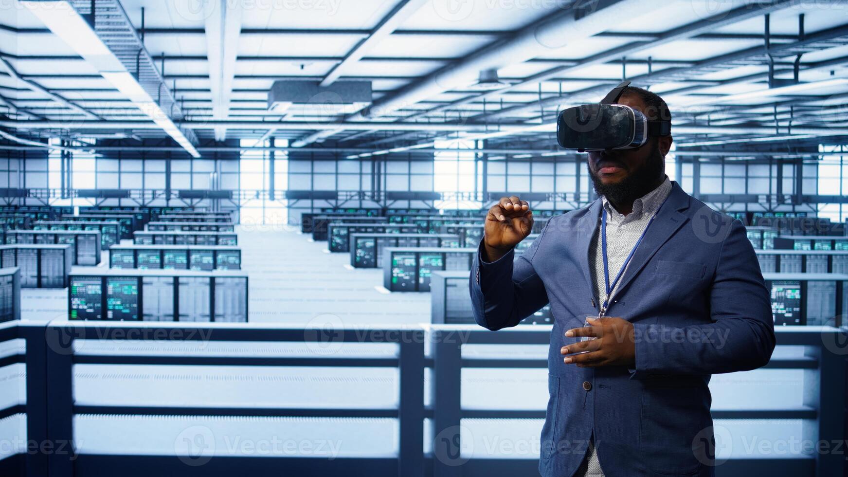 African american developer immersed in virtual reality at data center, doing units maintenance. Technician using VR headset to optimize servers performance, checking operations, camera B Pro Photo