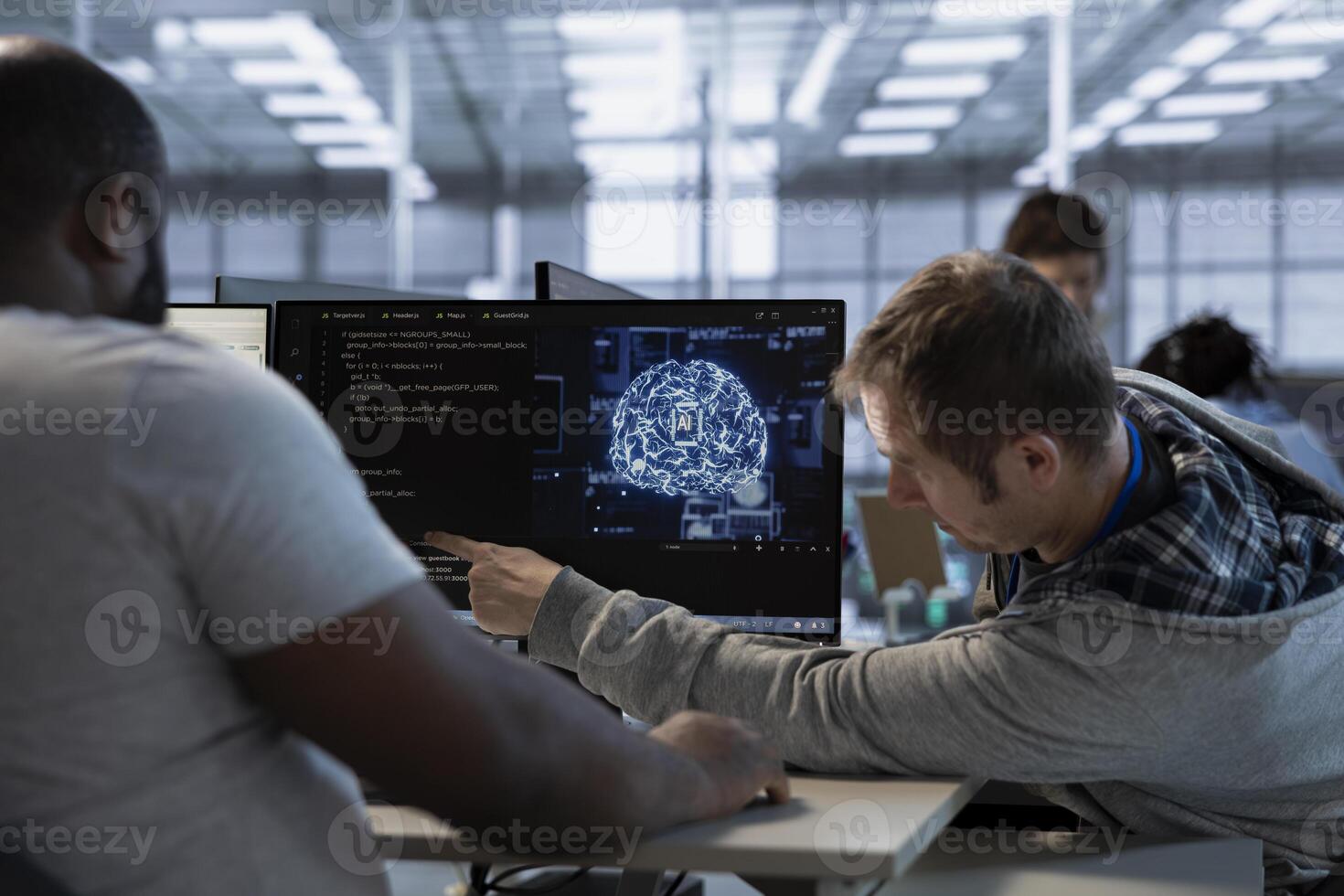 Team of admins does data center workplace automation using AI and machine learning tools. Teamworking colleagues integrating artificial intelligence driven automation in server hub facility operations Pro Photo