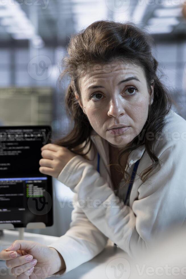 Technician using tablet to implement cybersecurity measures to protect data center assets. Woman in server hub monitoring and analyzing metrics with device to enhance operational effectiveness Pro Photo