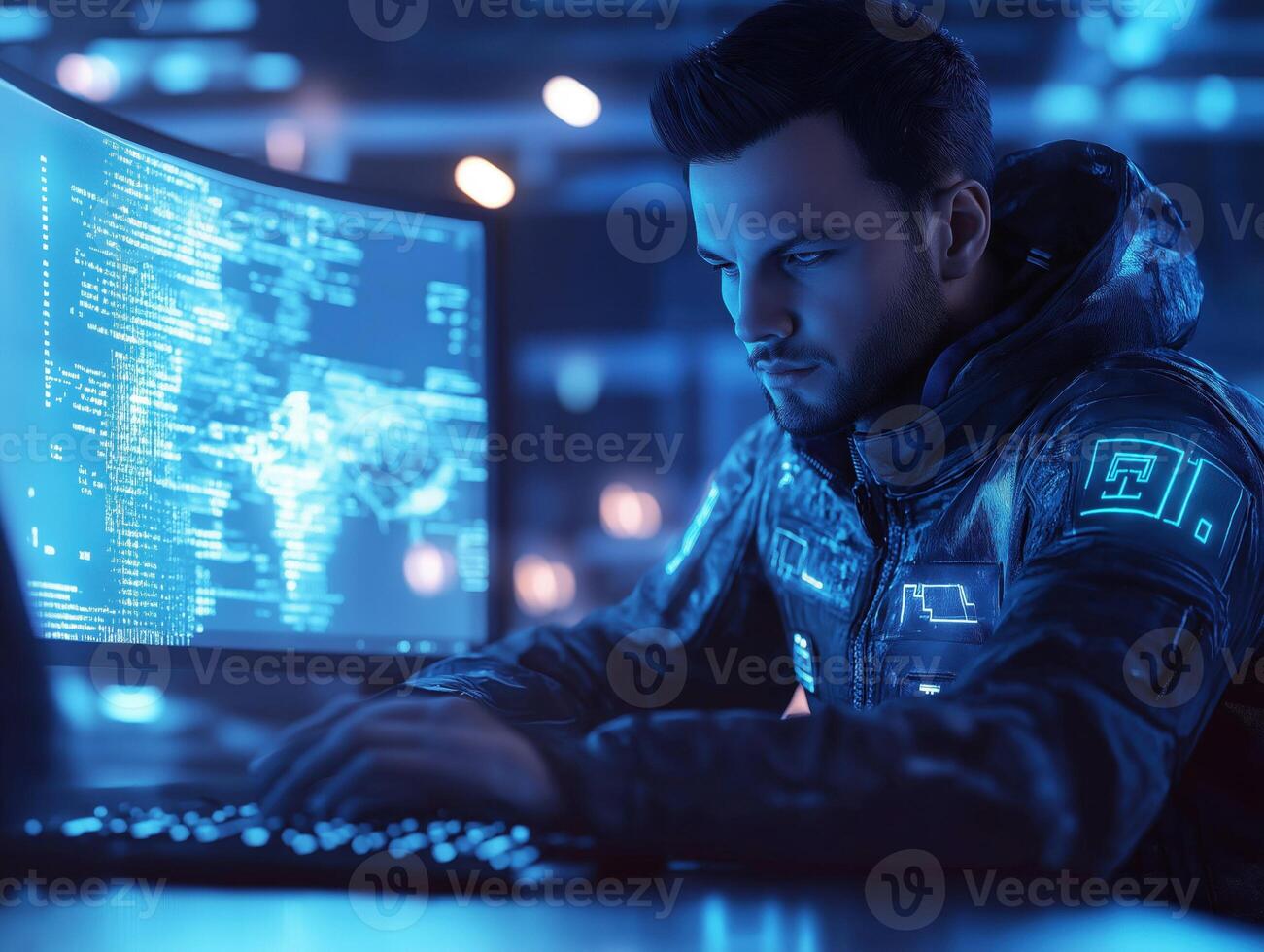 Software developer working on source code displayed on curved monitor in modern office environment with futuristic neon lights Pro Photo
