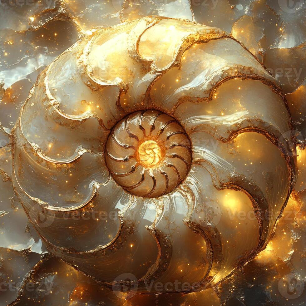 Ammonite gold shell showcasing intricate patterns and shimmering details in a natural setting during daylight Pro Photo