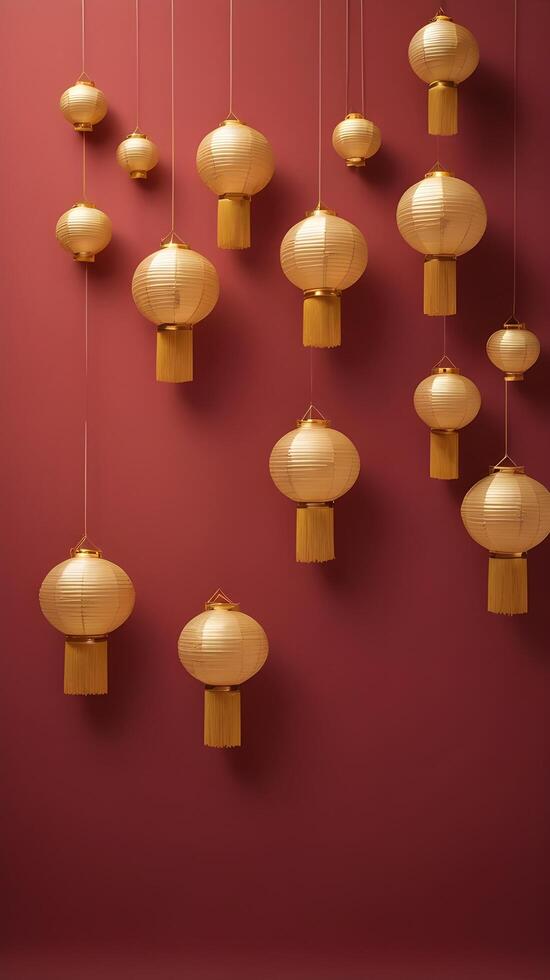 A minimalist pattern of golden lanterns with soft gradients, floating in front of a muted red background, with room for text. photo