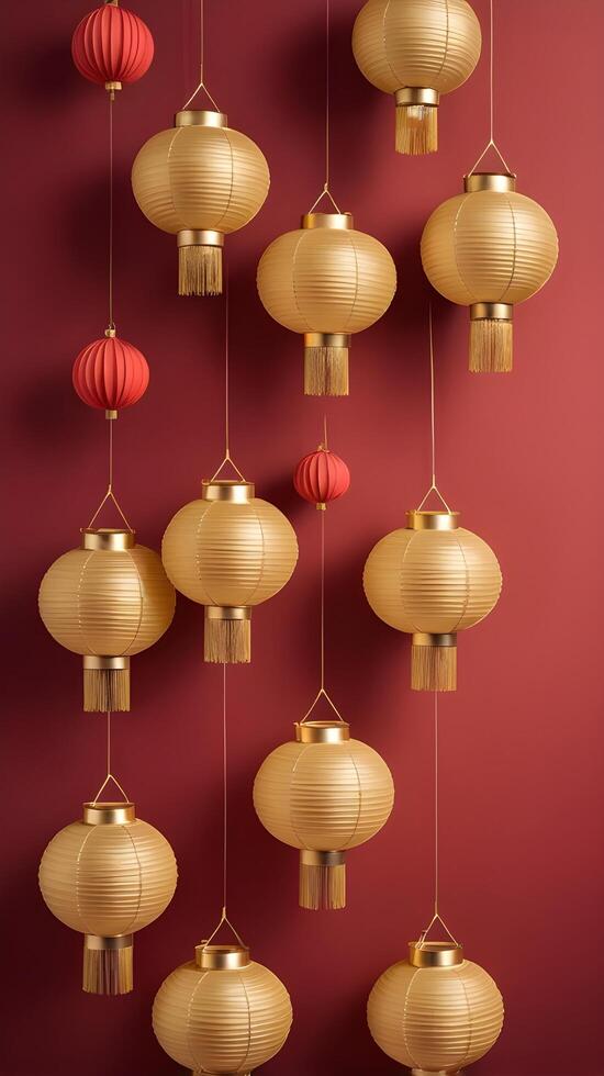 A clean, abstract design with golden lanterns floating in gradients, against a muted red background, providing space for text. photo