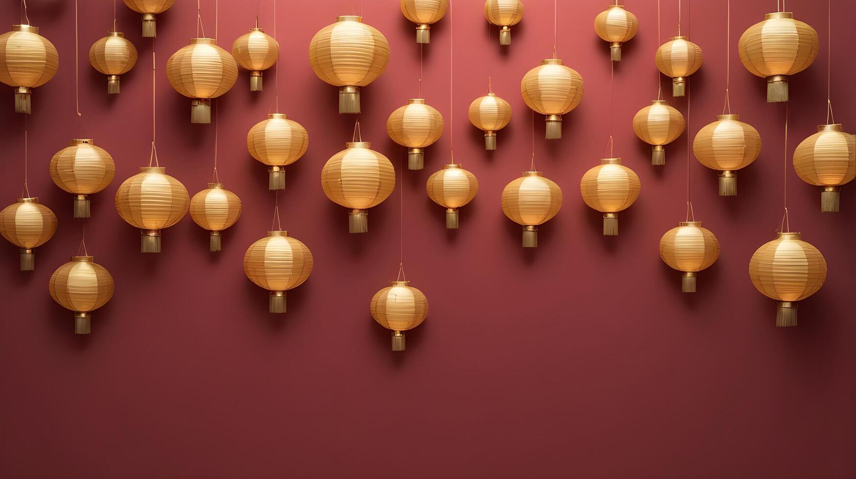 Floating golden lanterns in an abstract, minimalist design with soft gradients and a muted red background, perfect for adding text. Free Photo