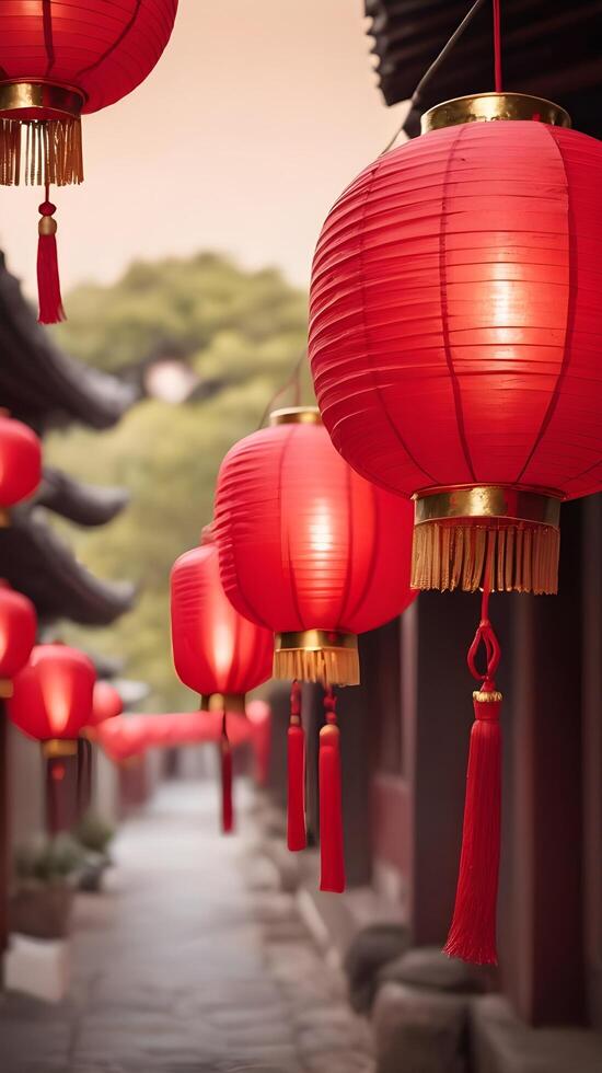 A calming scene with red lanterns floating above, a soft, blurred background offering space to add text. photo