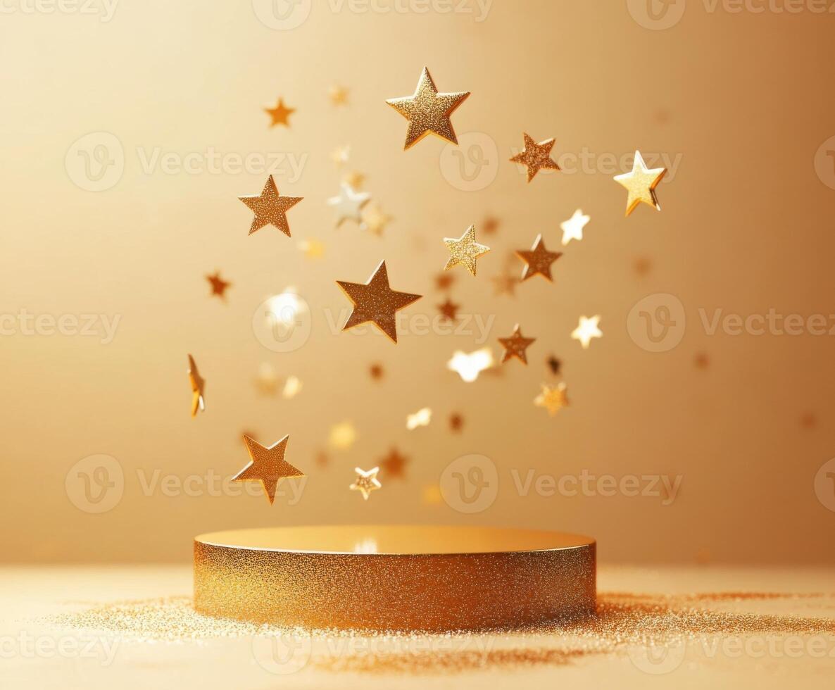 Sparkling golden stars hover above a shimmering circular platform in a warm, inviting light setting Pro Photo