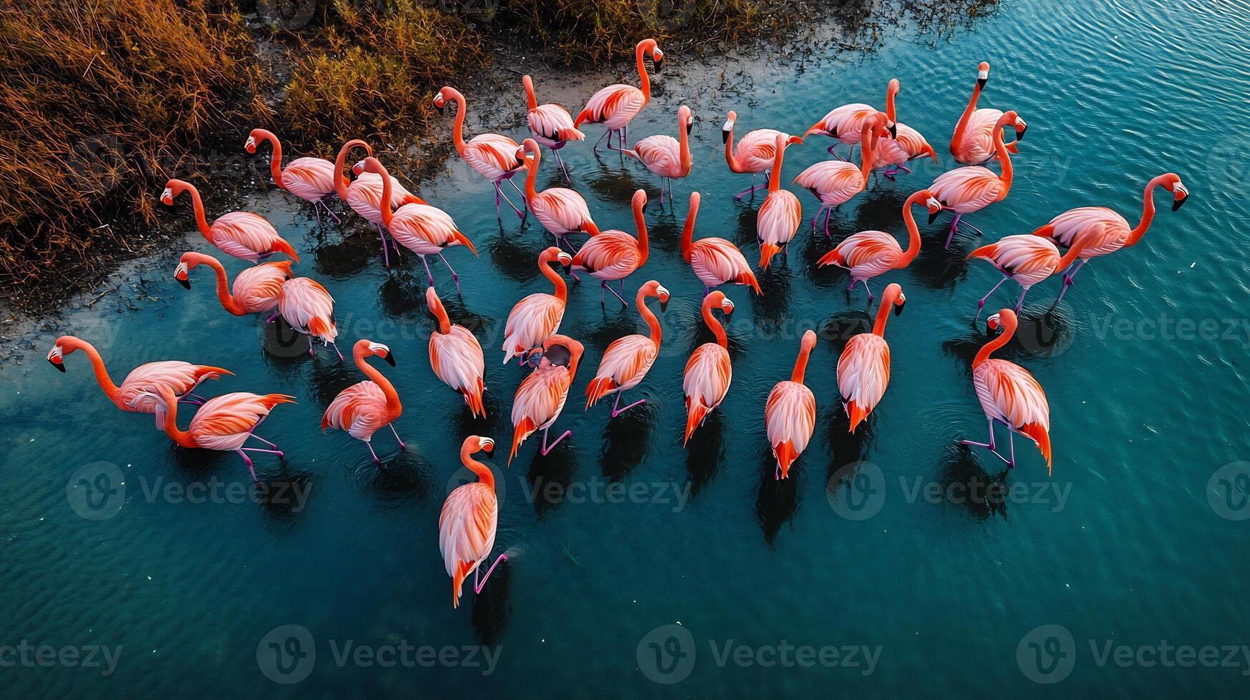 Aerial view of massive flock of flamingos wading shallow wetlands their pink feathers creating a striking contrast with the reflective blue water captured with a drone camera for intricate patterns Pro Photo