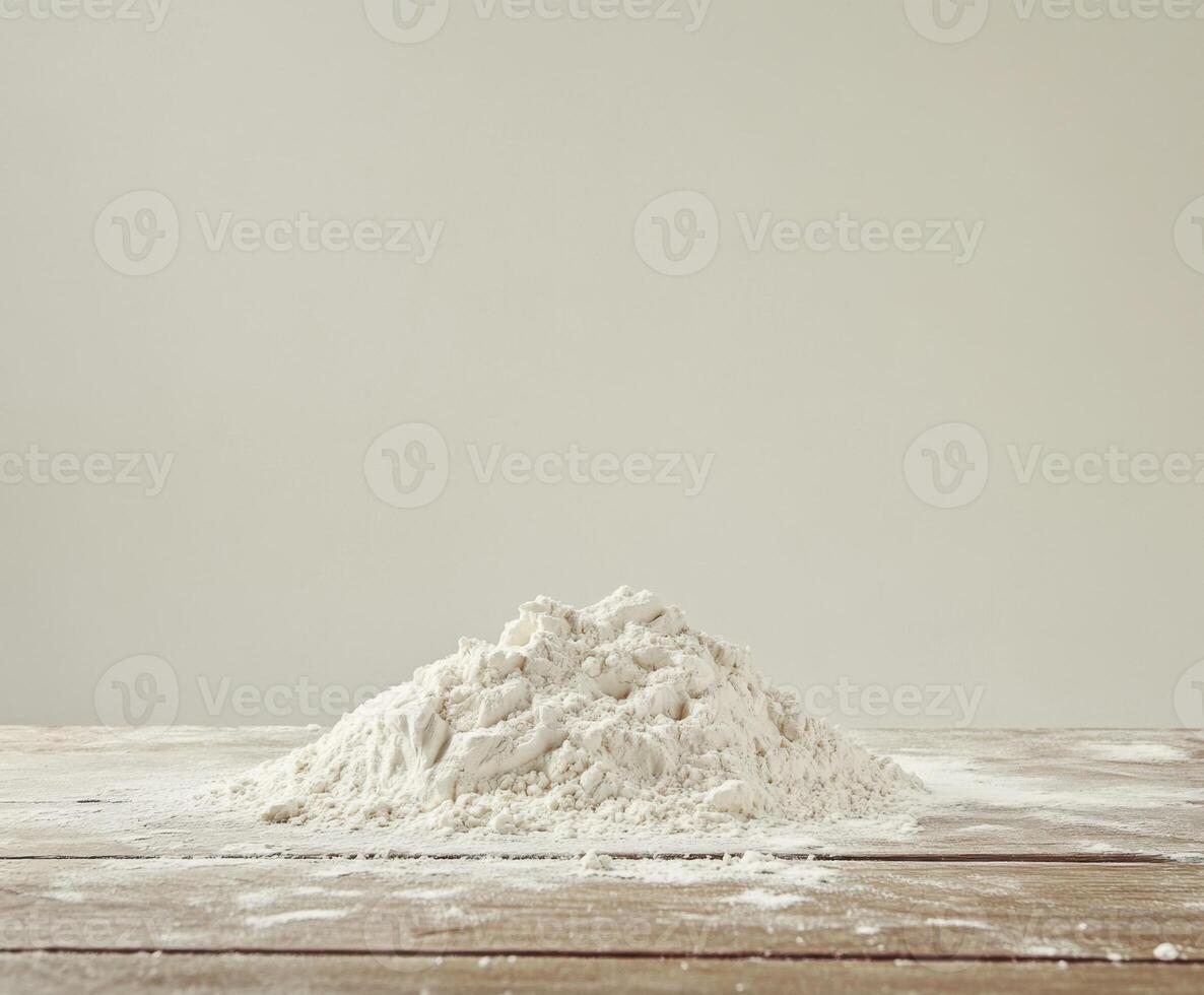 Flour pile on wooden surface with soft lighting creating an inviting atmosphere for baking activities Pro Photo