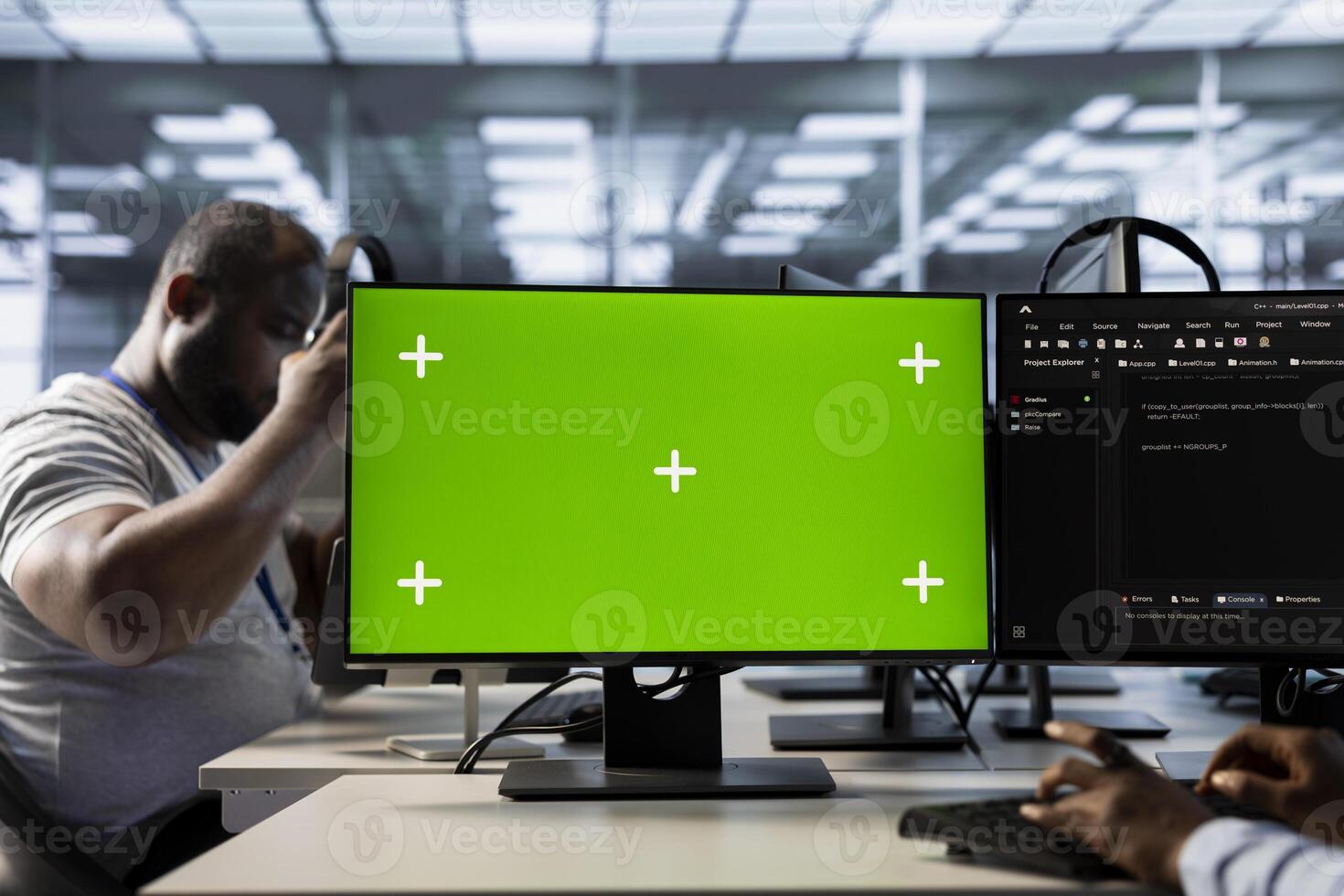Data center expert using green screen PC to write disaster recovery plans ensuring minimal downtime. Server farm worker uses mockup computer display to monitor performance Pro Photo