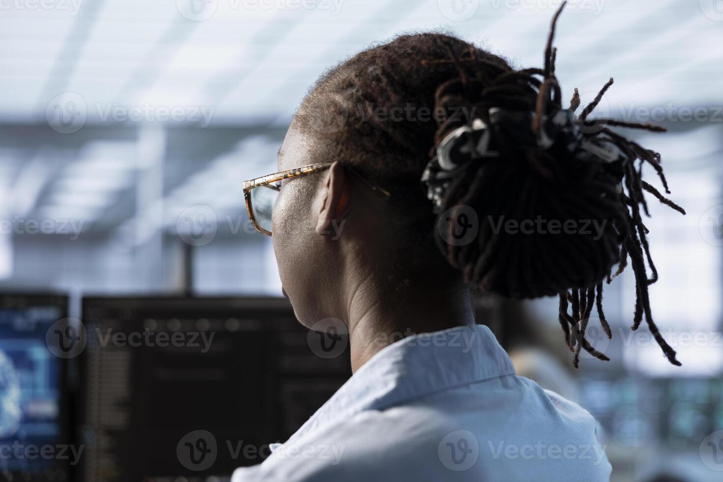 Woman sitting at computer desk, finishing programming tasks in AI data center used for machine learning training. Close up shot of engineer upgrading artificial intelligence tech Pro Photo
