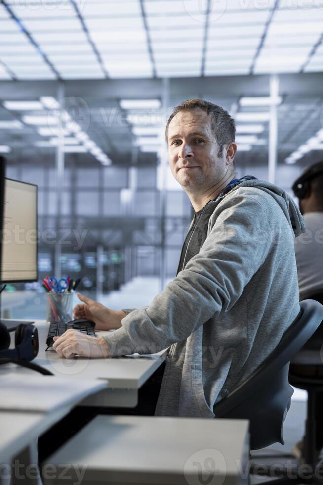 Portrait of upbeat engineer inspecting server rows in data center. Cheerful man supervising supercomputers providing processing and memory resources for various workloads Pro Photo