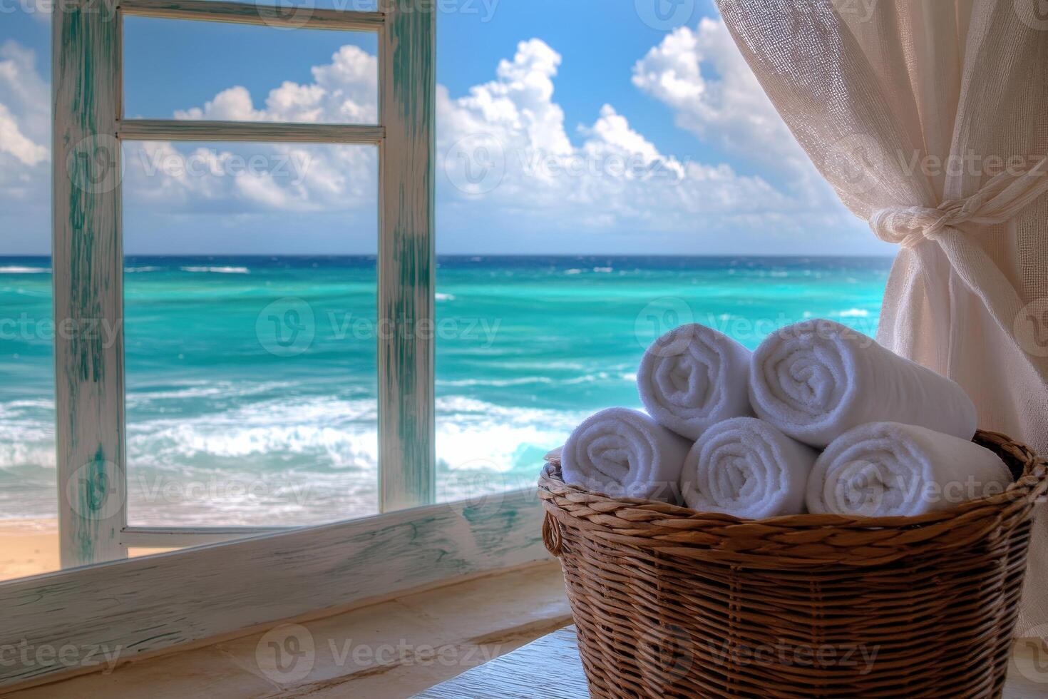 Refreshing view of turquoise ocean from open window with rolled white towels in basket Pro Photo
