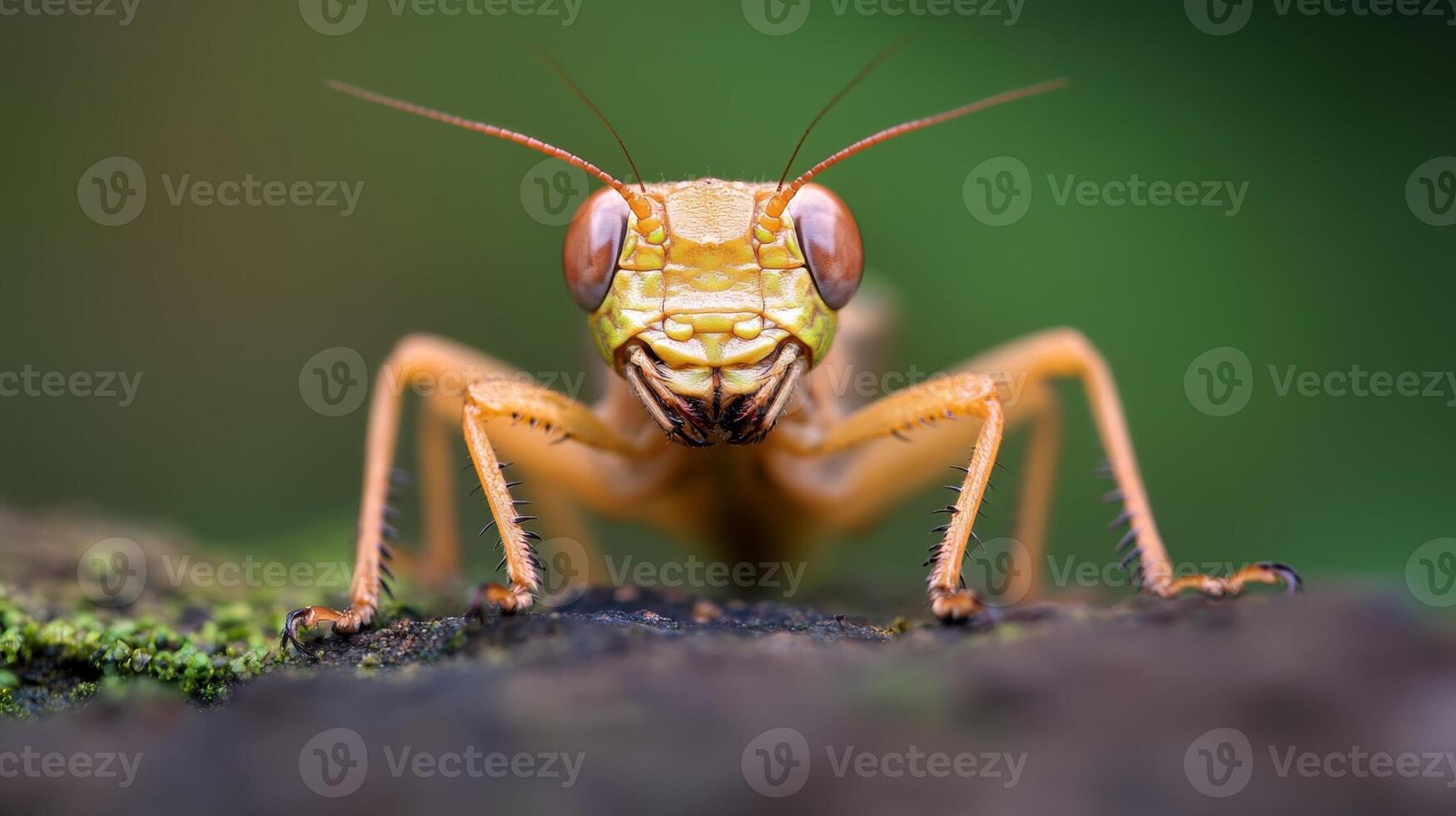 Close-up view of a vibrant grasshopper resting on a mossy surface in the wild during daylight hours Pro Photo