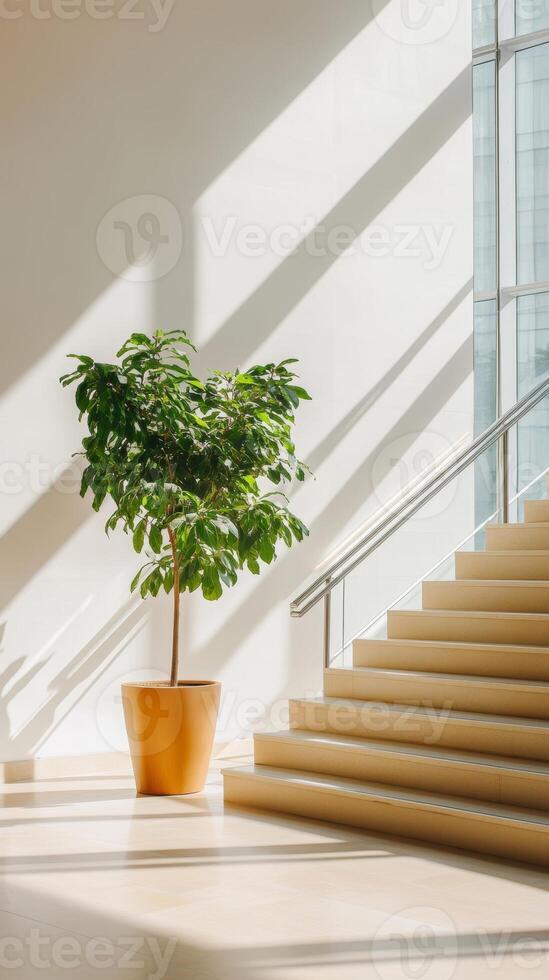 A potted tree stands next to large windows, casting shadows on the stairs in a modern building during daylight Pro Photo
