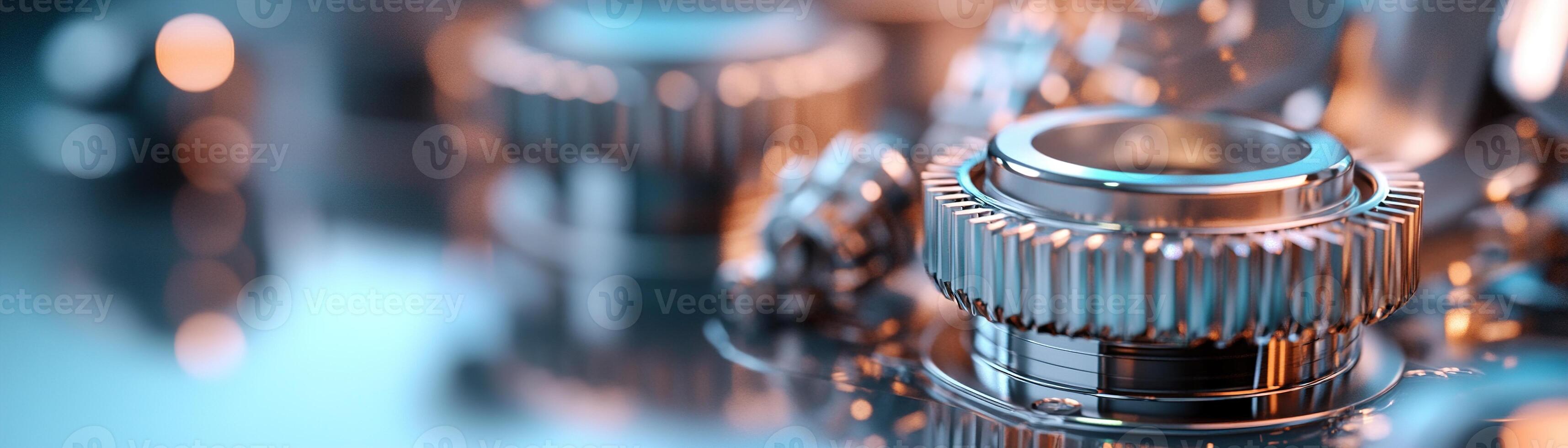 Shiny engine parts and gears are neatly displayed on a reflective surface, showcasing their intricate designs against a soft gradient background that highlights mechanical details Pro Photo