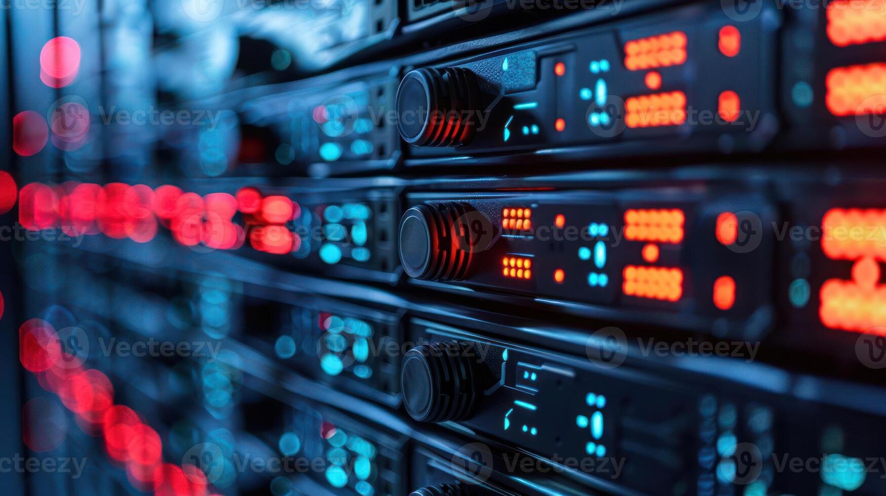 Close-up view of illuminated server racks in a data center with vibrant LED indicators Pro Photo