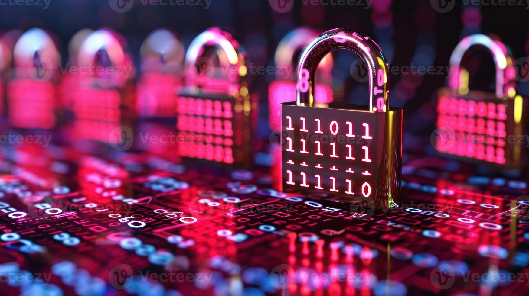 Digital padlocks with binary code on a vibrant neon background, symbolizing cybersecurity Pro Photo