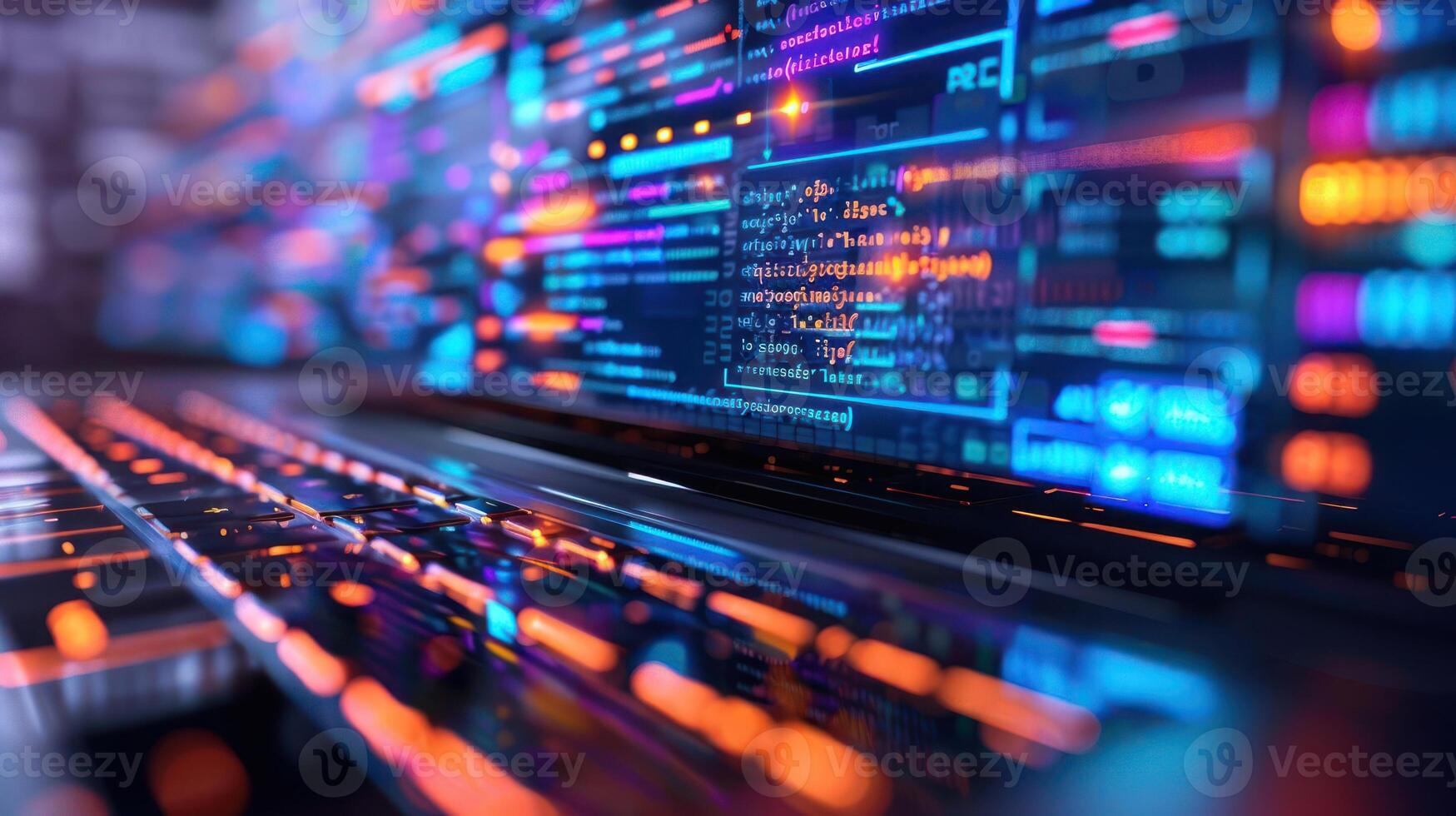 Close-up view of a laptop keyboard with vibrant code display, showcasing digital technology and innovation Pro Photo