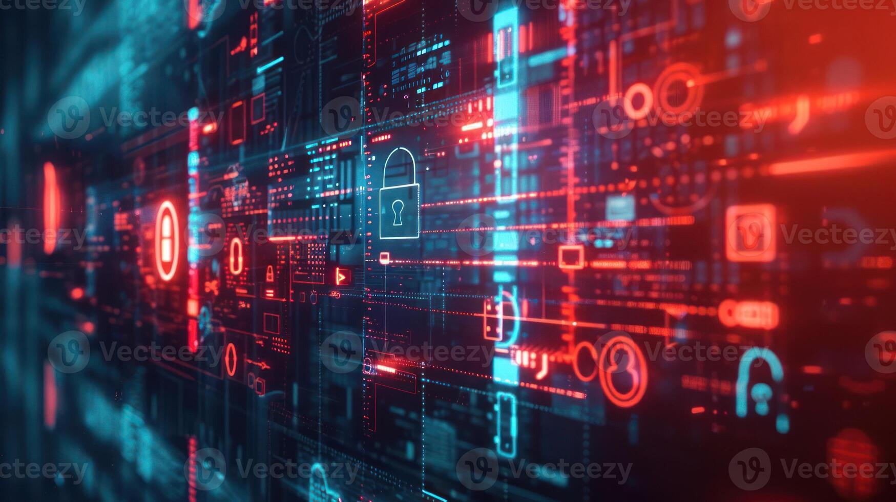 Abstract digital background with glowing security icons and data streams in a futuristic setting Pro Photo