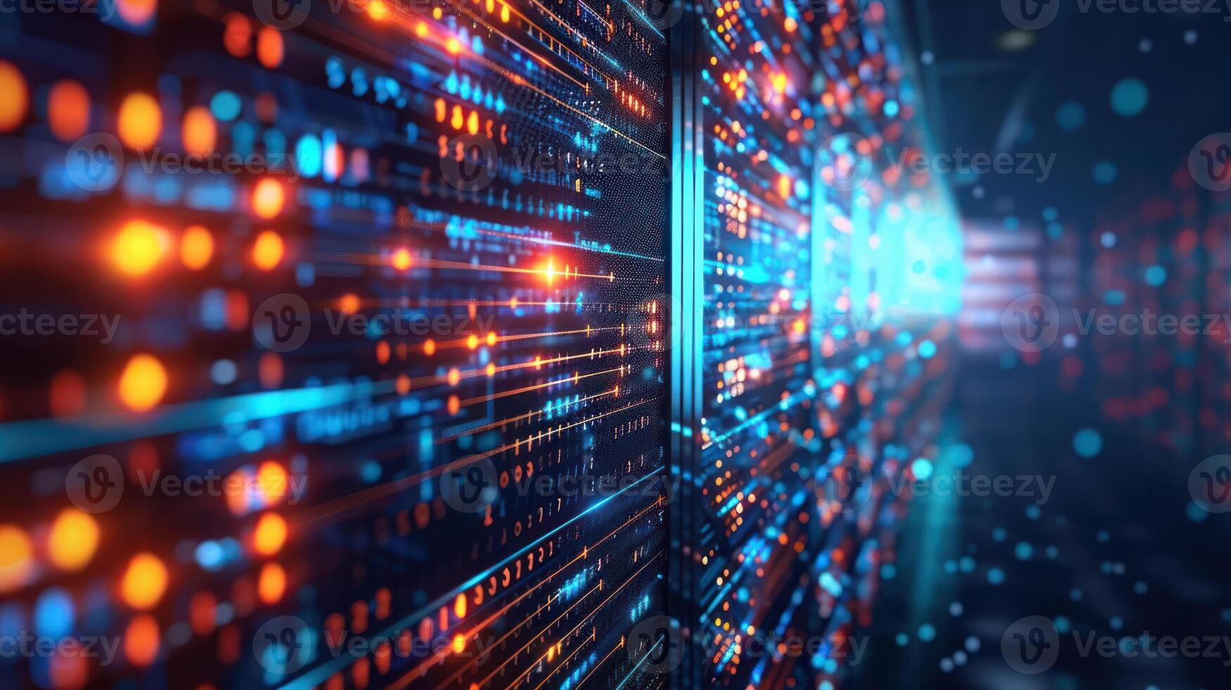 Futuristic data center with illuminated server racks displaying vibrant digital patterns Pro Photo