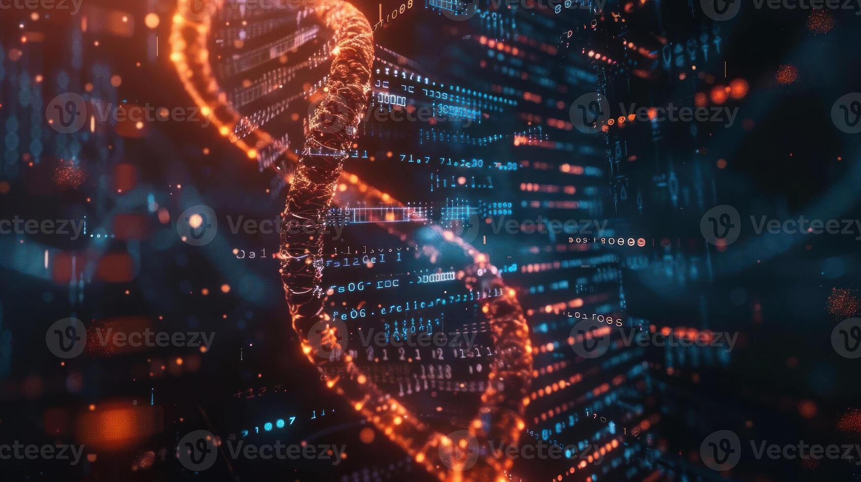 Abstract representation of DNA structure intertwined with digital data in a futuristic environment Pro Photo