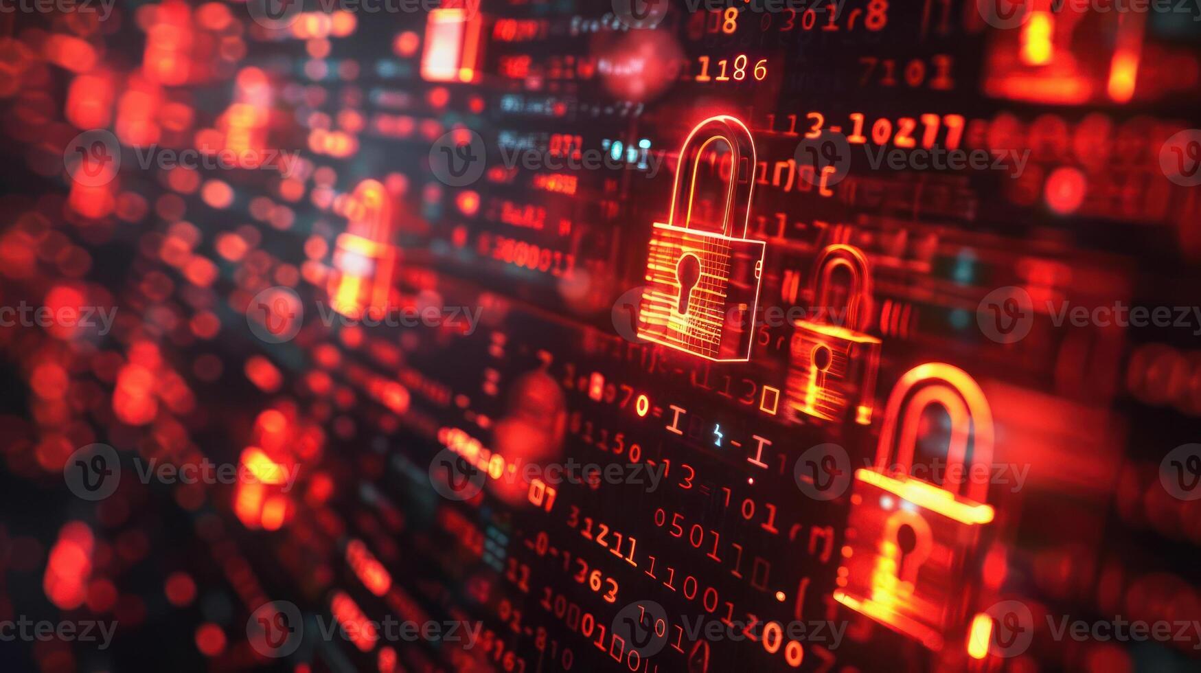 Abstract digital background featuring glowing padlocks amidst red binary code, symbolizing cybersecurity Pro Photo