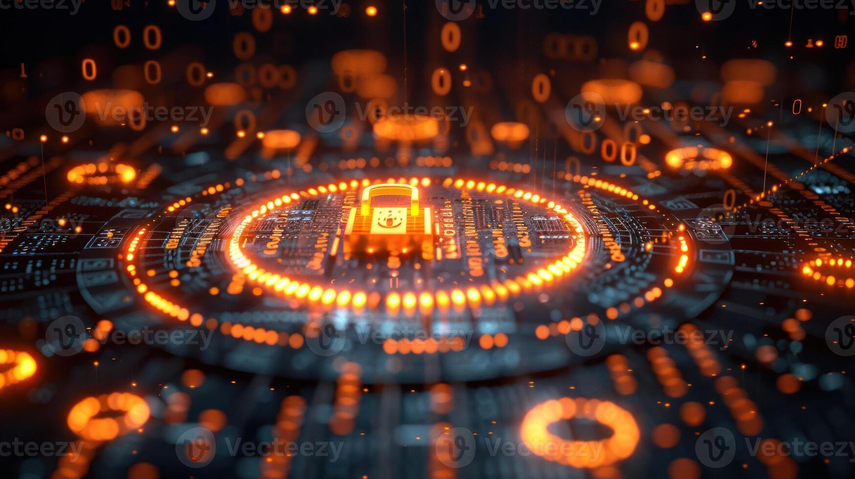 Abstract digital circuit board with glowing orange elements and binary code in dark background Pro Photo