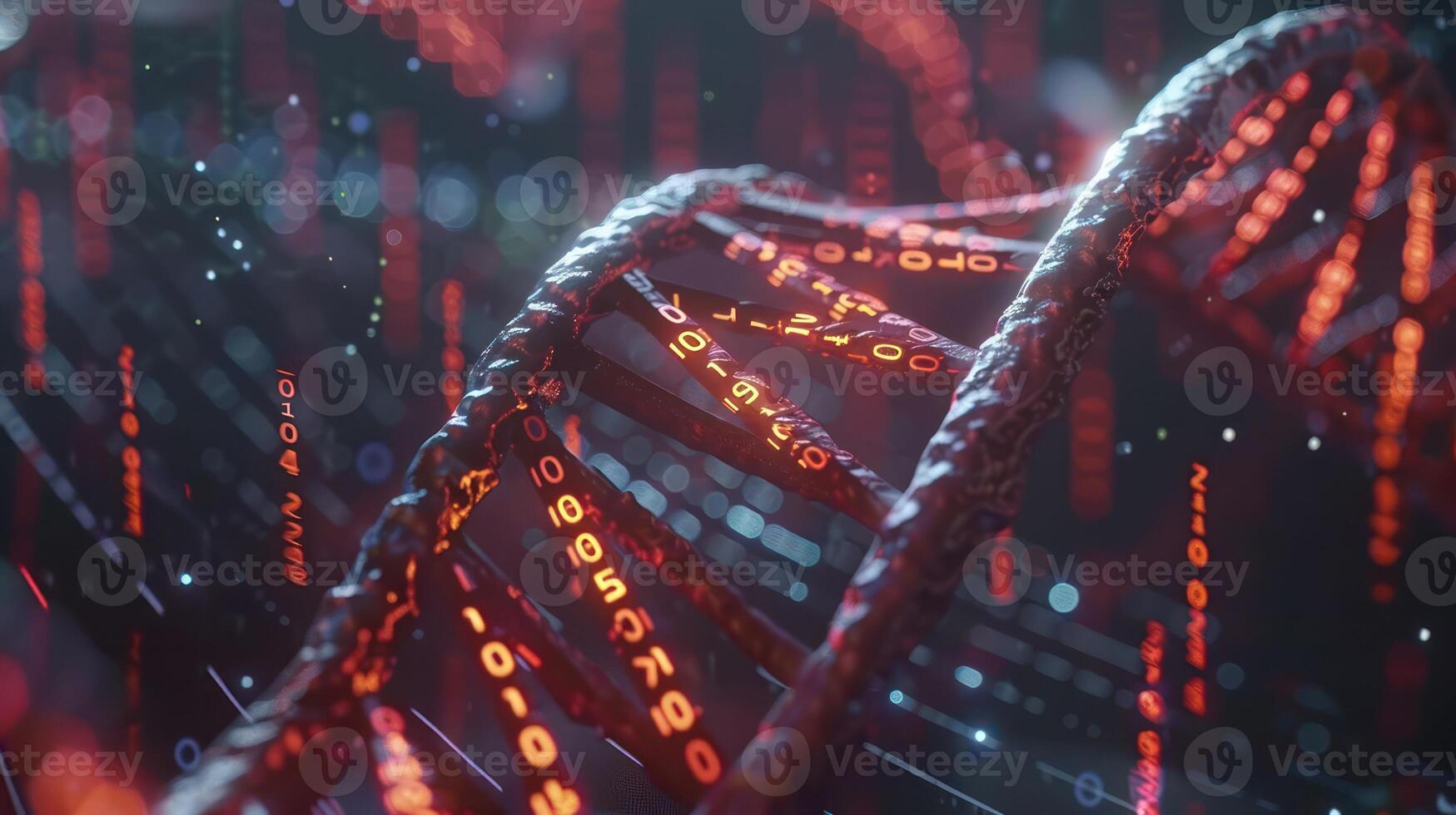 Intricate digital representation of DNA strands intertwined with binary code in a futuristic setting Pro Photo
