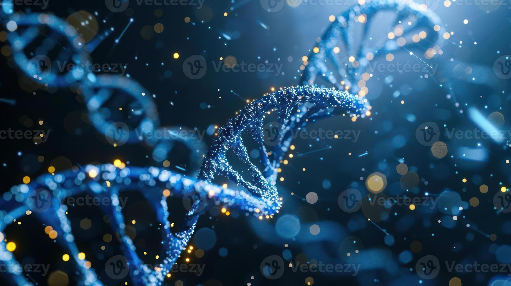 Close-up view of a DNA double helix structure with shimmering particles in a scientific environment Pro Photo