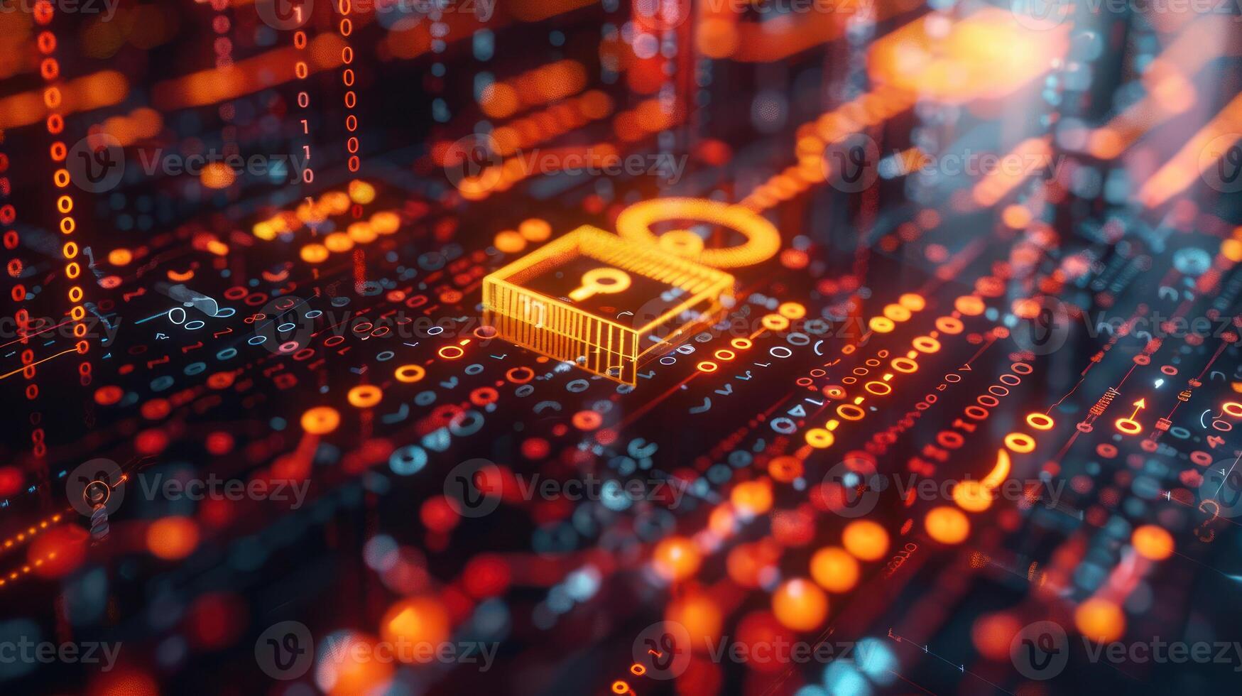Abstract digital representation of cybersecurity with glowing lock and data streams in background Pro Photo