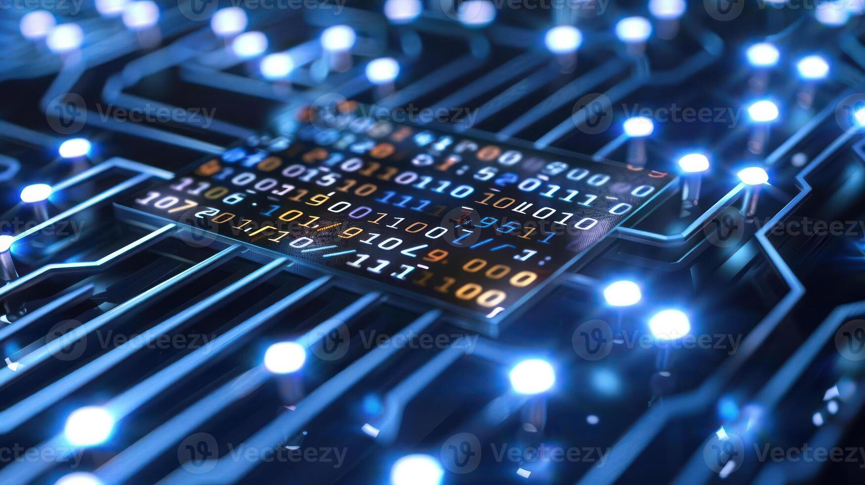 Close-up of a futuristic circuit board with glowing lights and binary code, showcasing technology Pro Photo