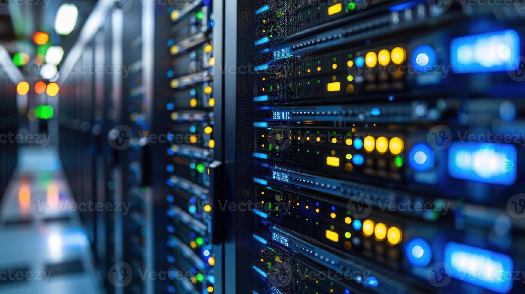 Close-up view of server racks in a data center with illuminated indicators and cables Pro Photo