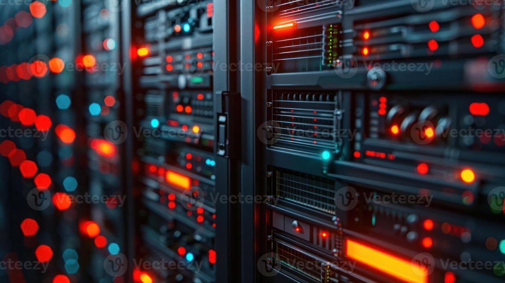 Close-up view of server racks illuminated by colorful lights in a data center environment Pro Photo