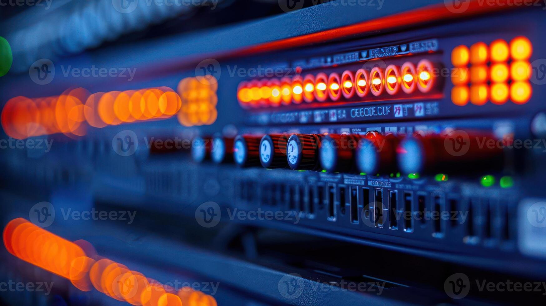 Close-up of illuminated server rack showcasing data processing equipment in a tech environment Pro Photo
