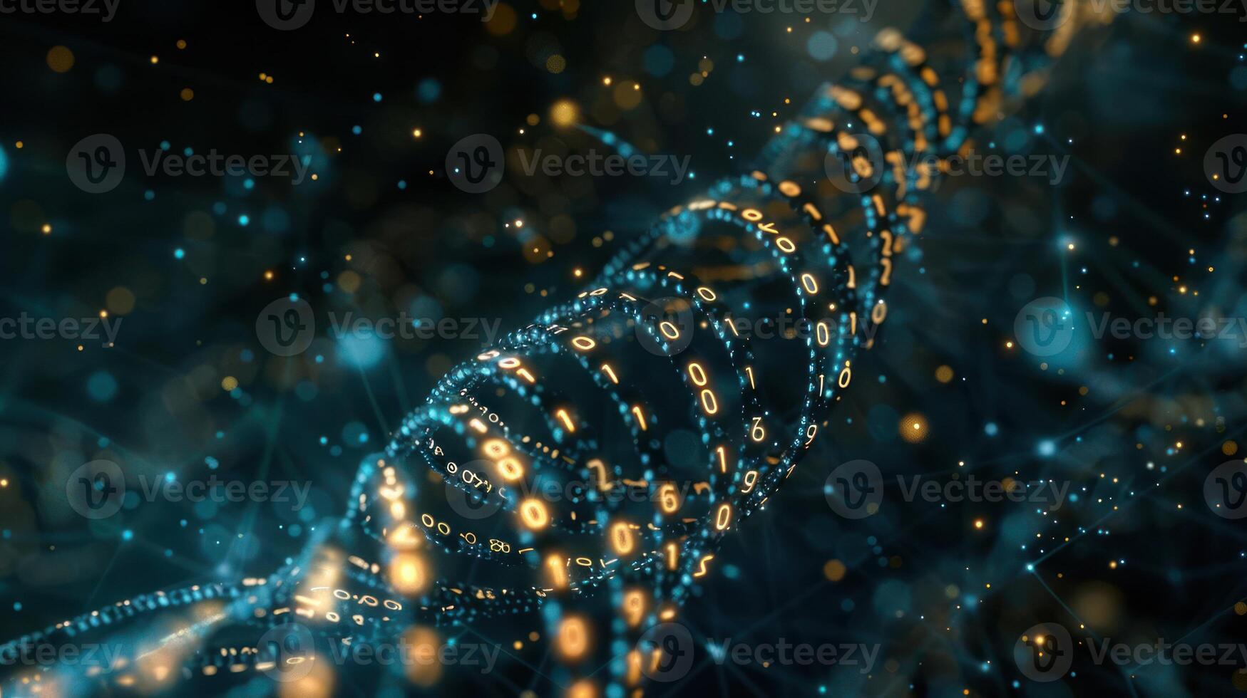 Abstract representation of digital DNA helix composed of glowing binary code against a cosmic backdrop Pro Photo