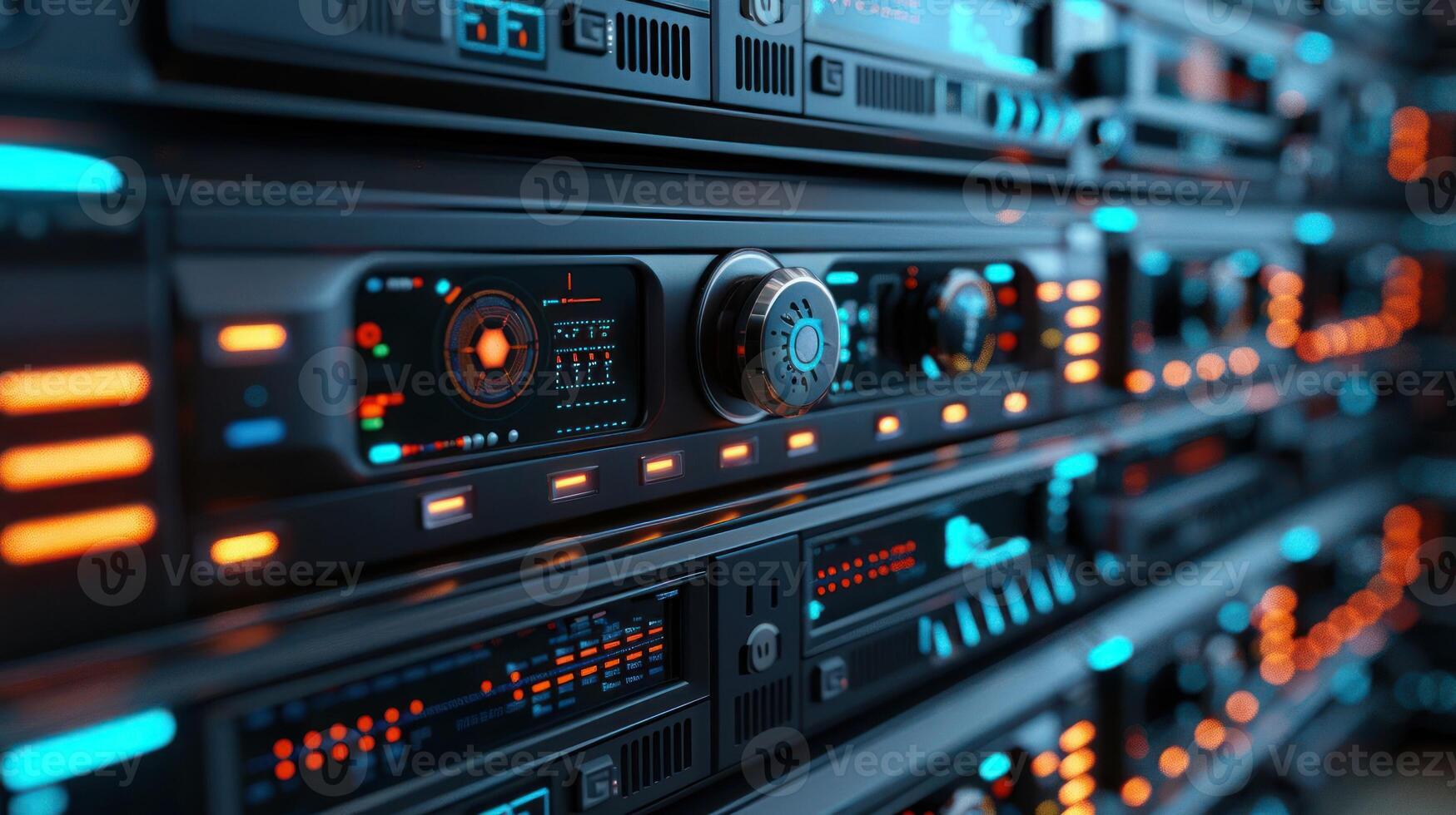 Close-up view of illuminated server racks showcasing technology and data processing in a modern data center Pro Photo